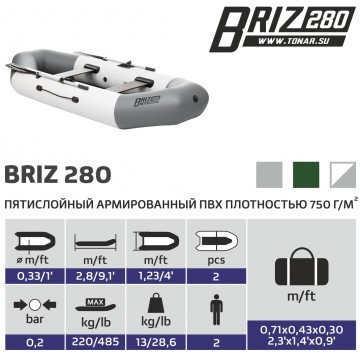 Гребная ПВХ лодка Тонар Бриз 280 отличное решение для рыболовной ловли и охоты, прогулок на воде. Двухместная с 2 независимыми отсеками для Вашей безопасности. Лодки изготавливаются в России из пятислойного ПВХ 750 гр/м2 и качественной фурнитуры (ПВХ производства Германии и Южной Кореи). Рекомендуемая нагрузка до 220 кг.